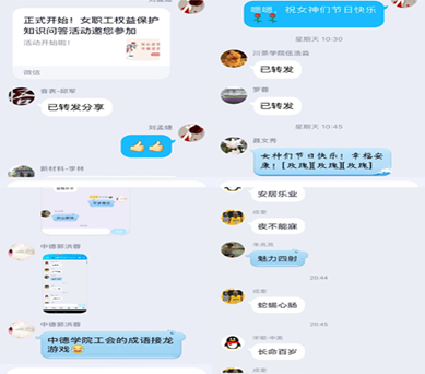 校工会常务副主席聂文秀代表学校工会女工委员会在工作群内为大家送上节日的祝福,鼓励各二级工会一定要组织开展好这个特殊时期的节日,让广大女教职工在抗疫期间也感受到职工之家的温暖。