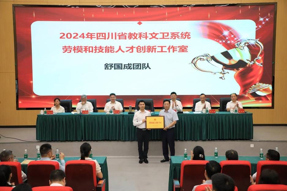 校领导、党委常委分别为工会积极分子、优秀工会干部、先进工作者、美好家庭、工会集体代表颁奖,并向获得2024年四川省教科文卫体系统劳模和技能人才创新工作室的舒国成博士团队授牌。